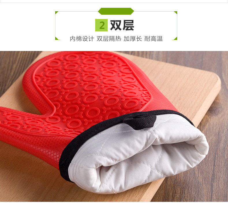 包装:单只装开口PP袋新款加长加厚双层防烫硅胶手套,采用棉布加硅胶双层防烫设计,棉布部分可以加印logo,双层设计更加耐热,该手套具有清洗方便、多重防滑、双层耐热、防水耐用等优势。