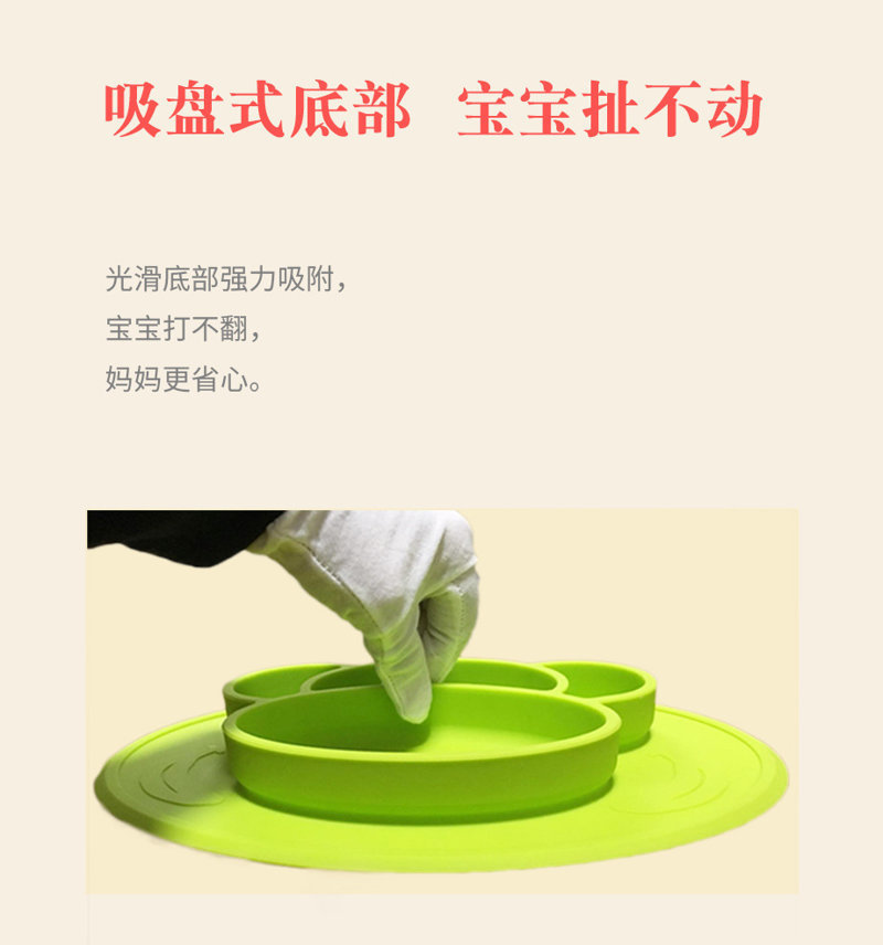 3、吸盘式底部,宝宝扯不动,光滑底部强力吸附,宝宝打不翻,妈妈更省心