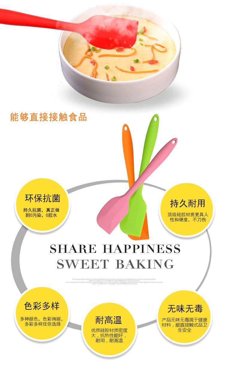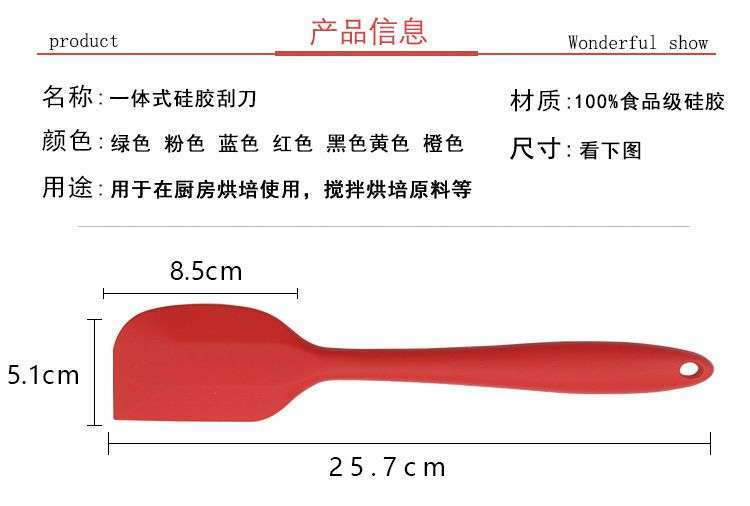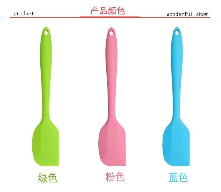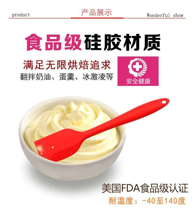 用途:做蛋糕,搅拌蛋白和蛋糕面糊均匀;可有效刮净搅拌盆表面的残留面糊、蛋白糊,集中食材并再次利用,减少损耗;抹平倒入模具中的面糊等等;清洗方便用于刮去不沾烤盘、不沾布、铝合金烤盘等上面的残渣、碎屑,不会刮伤产品表面。