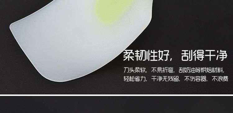 【用途】做蛋糕,搅拌蛋白和蛋糕面糊均匀而不消泡;可有效刮净搅拌盆表面的残留面糊、蛋白糊,集中食材并再次利用,减少损耗;抹平倒入模具中的面糊等等;清洗方便用于刮去不沾烤盘、不沾布、铝合金烤盘等上面的残渣、碎屑,不会刮伤产品表面。