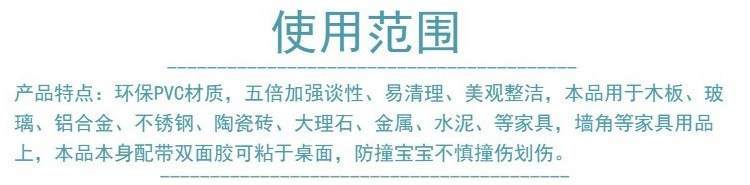 【适用范围】: 安全又美观,即让宝宝和您的家人免受碰撞之苦,同时又不妨碍家具整体造型。适用于一般家庭中的桌角/床角/书柜/玻璃茶几/楼梯角等容易产生危险的位置